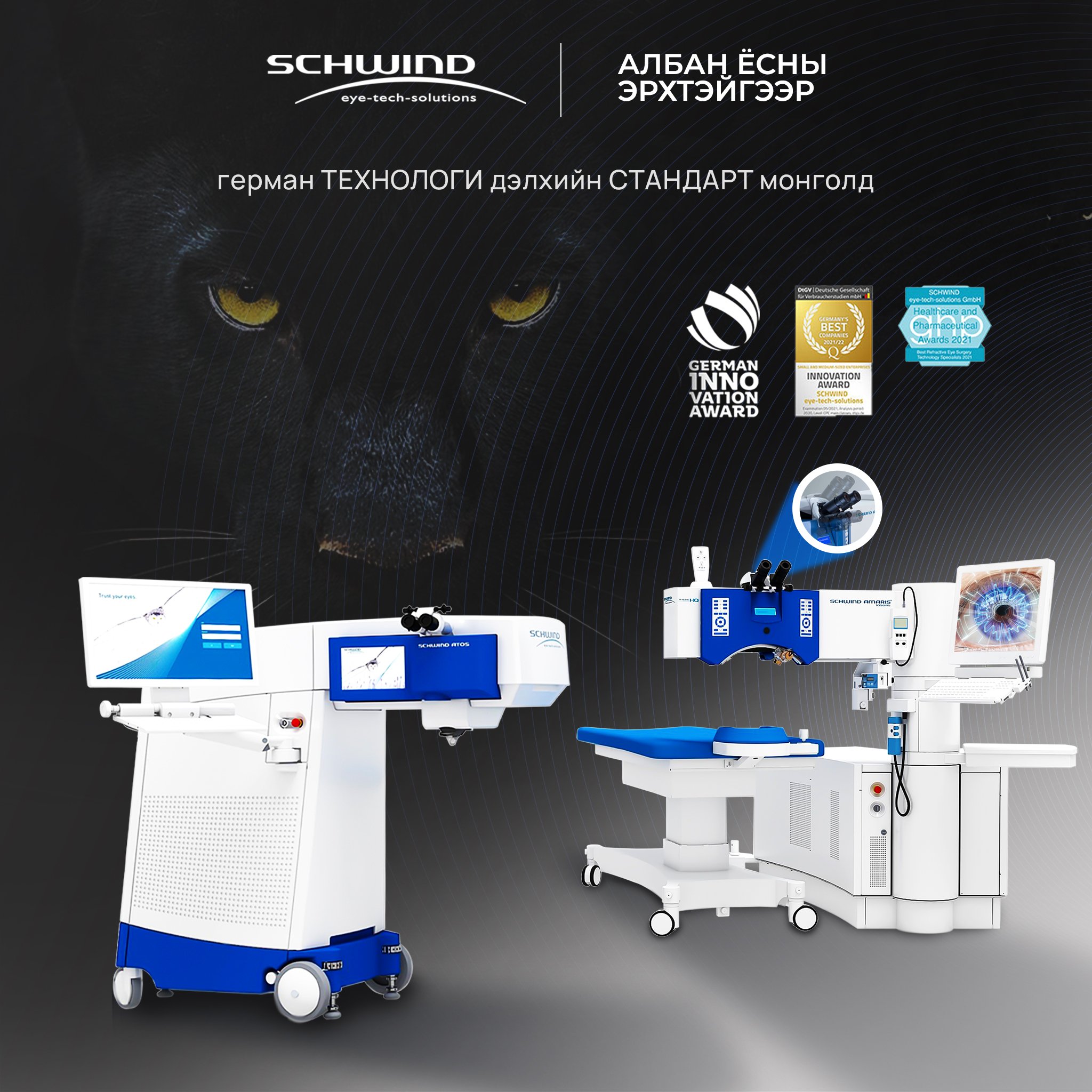 ХБНГУ-ын Schwind компани нь хараа заслын лазерын систем, тоног төхөөрөмж үйлдвэрлэл, хөгжүүлэлтийн чиглэлээр дэлхийд тэргүүлэгчдийн нэг бөгөөд 180 улс орны 2500 гаруй нүдний эмнэлэгтэй хамтран ажилладаг, LASIK-ийн хөгжүүлэлтээр дэлхийд тэргүүлэгч ОУ-н компани бөгөөд зүслэггүй хийгддэг мэс заслын ATOS төхөөрөмж нь 2021 оны Герман улсын шилдэг технологийн шагнал “German Innovation Awards 2021” хүртсэн технологи юм.