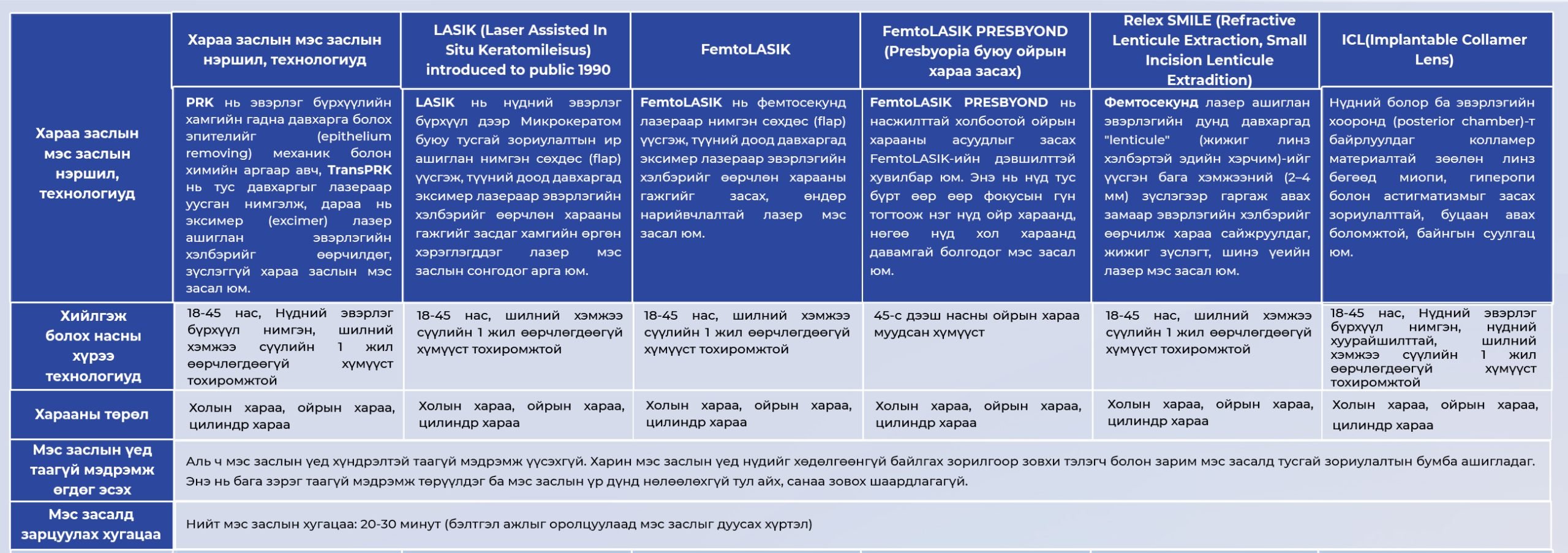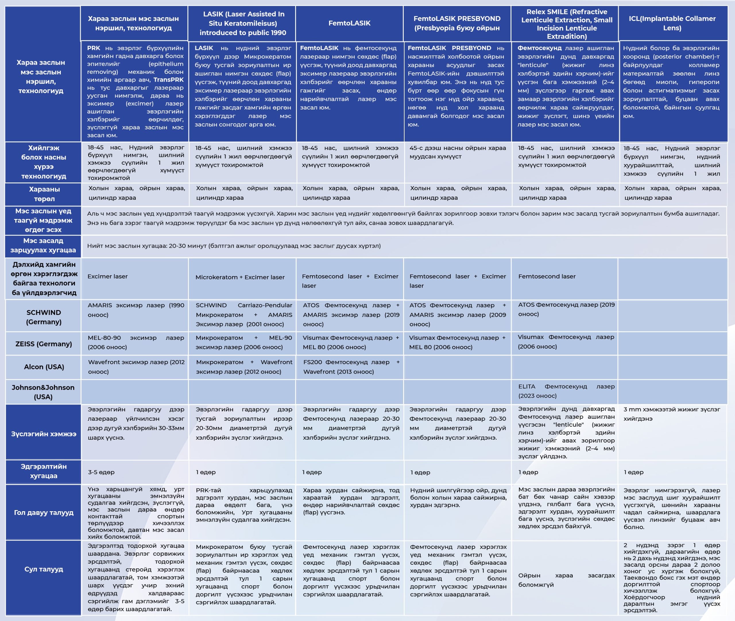 "Солонго хараа заслын төв" эмнэлэгт хараа зүйн үзлэг оношилгоо хийлгэх, LASIK мэс засалд хамрагдах ерөнхий процесс дараалал, цаг хугацаа, анхаарах зүйлс (Мэс засал сонирхож буй үйлчлүүлэгчдэд зориулсан мэдээлэл)